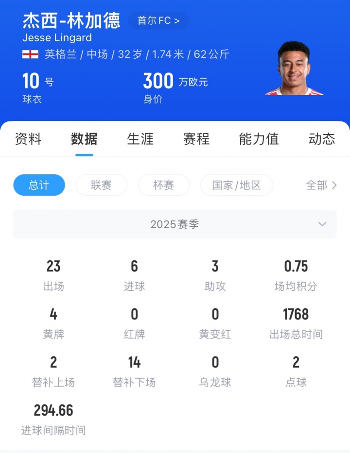林加德現年32歲,本賽季為球隊出場(chǎng)23次,貢獻6球3助。