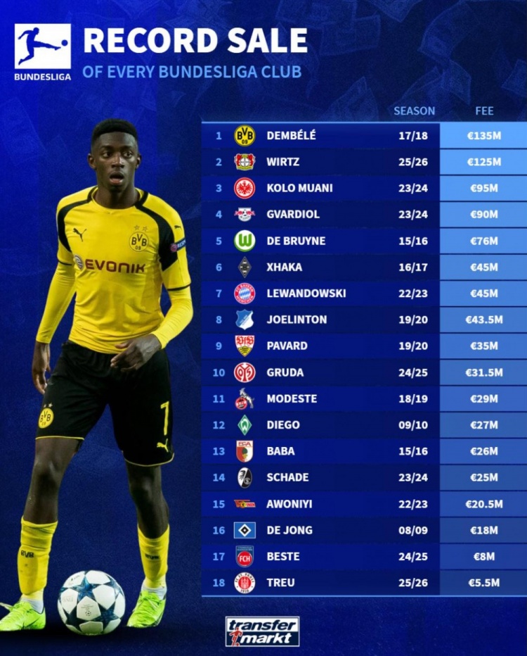 1、多特:登貝萊,1.35億歐,17-18賽季