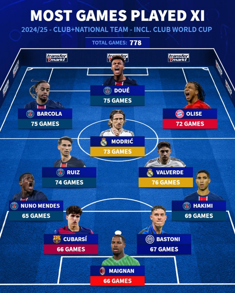 上賽季出場(chǎng)最多球員陣容(包括俱樂(lè )部+國家隊)