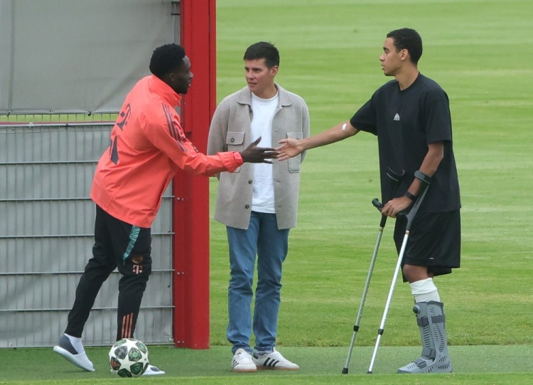 圖片報:穆西亞拉首次拄拐出現在訓練場(chǎng),他心情很好&戴維斯陪同