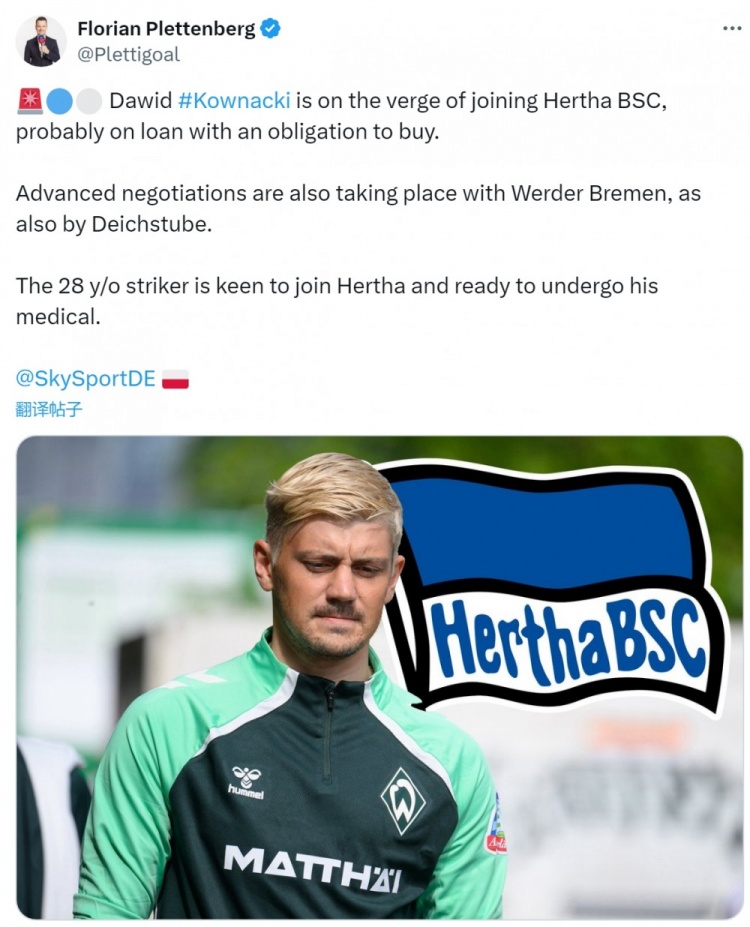 媒體指出,不萊梅28歲前鋒考納茨基接近加盟柏林赫塔,交易方式可能是租借+強制買(mǎi)斷。