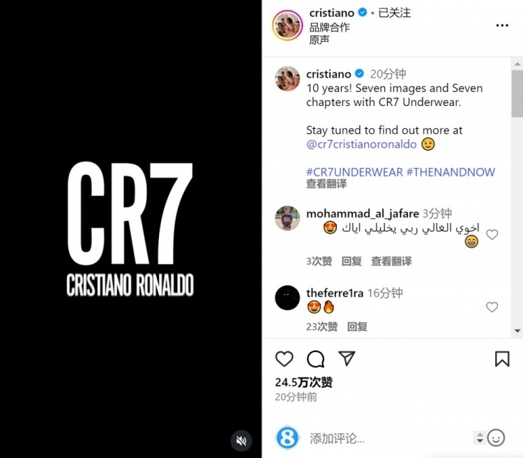 無(wú)敵身材!C羅社媒曬CR7內衣品牌宣傳視頻