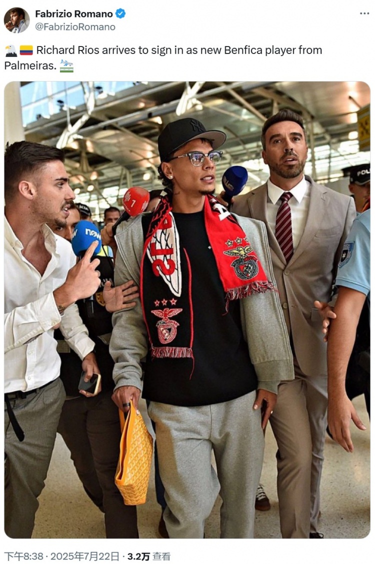 羅馬諾在社交媒體上曬出里奧斯戴著(zhù)本菲卡圍巾的照片,并配文寫(xiě)道:“理查德-里奧斯抵達(里斯本),以完成從帕爾梅拉斯轉會(huì )至本菲卡的簽約?!?/span>