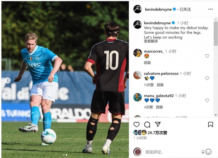 德布勞內社媒曬出比賽照片,并配文:“很高興在今天上演首秀,這些比賽時(shí)間有助于恢復狀態(tài),讓我們繼續努力?!?/p>