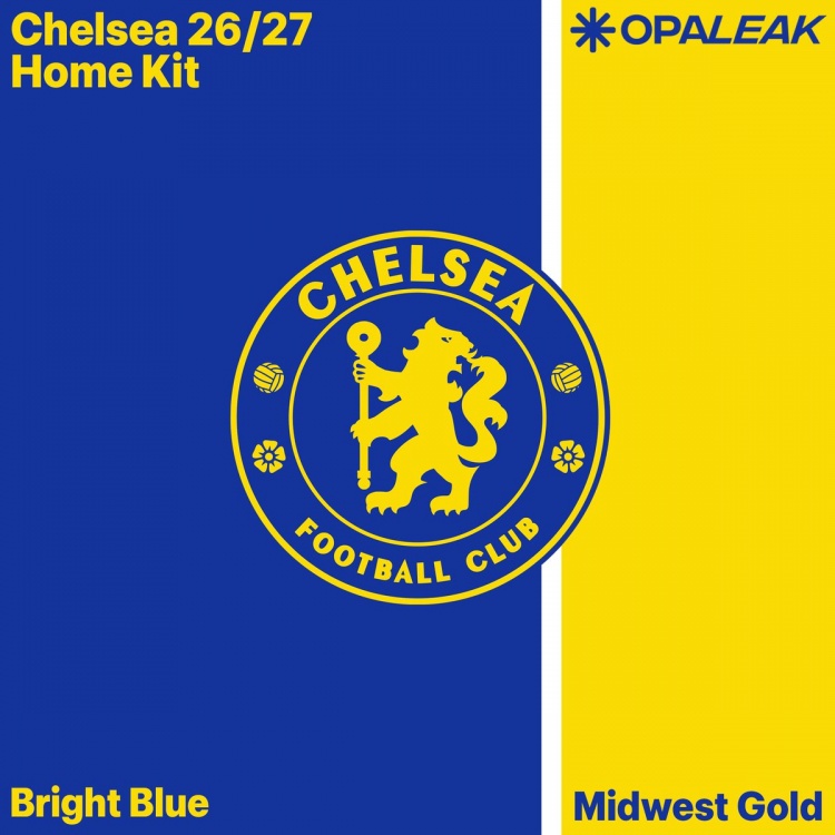 Opaleak社媒曬出圖片,透露2026-2027賽季切爾西主場(chǎng)球衣的主色調為傳統藍色,搭配黃色。