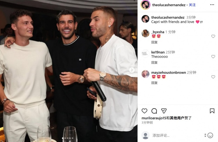7月23日訊 特奧在個(gè)人社媒曬出與兄弟盧卡斯-埃爾南德斯以及法國同胞帕瓦爾聚會(huì )合影,配文寫(xiě)道:“與朋友們在卡普里島度過(guò)有愛(ài)的時(shí)光?!?/p>