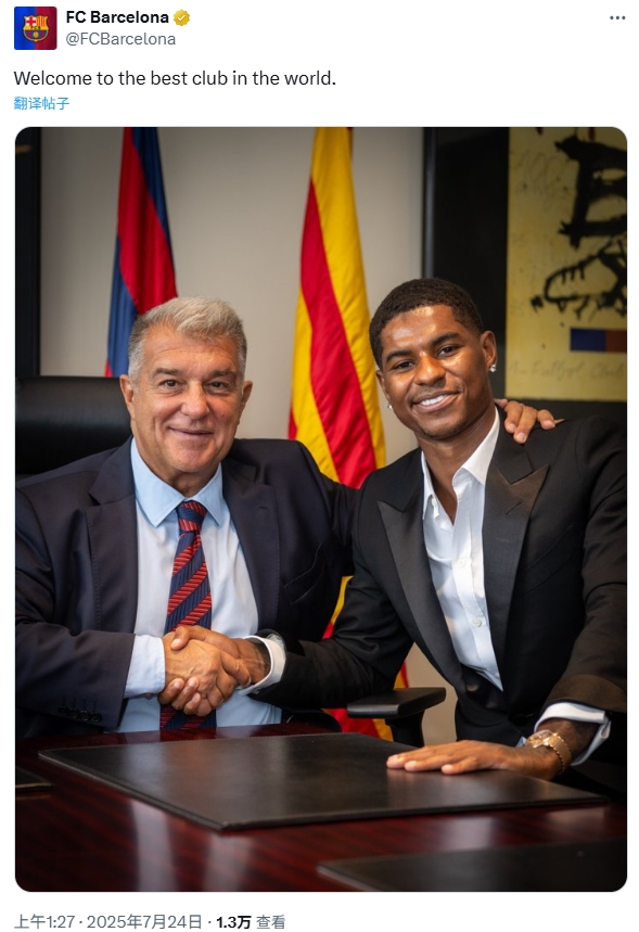 巴薩官推曬拉什福德與拉波爾塔握手圖,配文:“歡迎來(lái)到世界上最好的俱樂(lè )部??”。