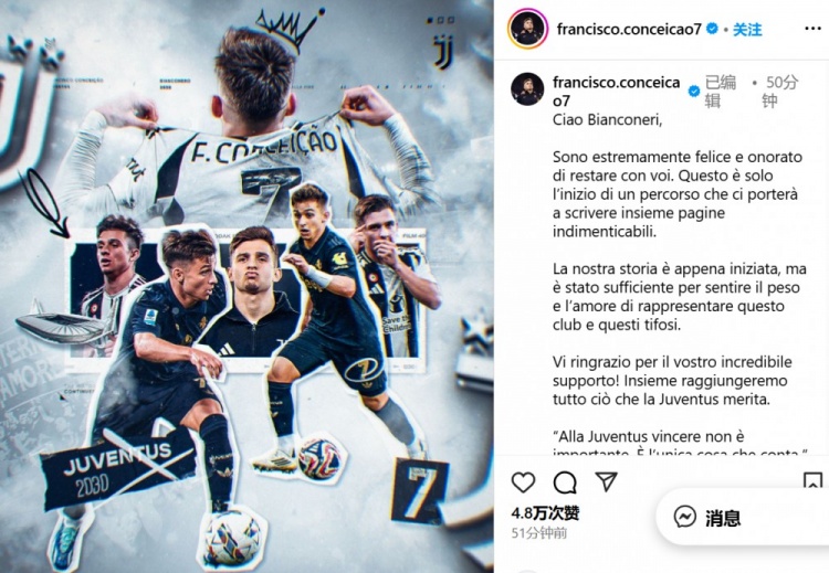 他寫(xiě)道:“你們好,Bianconeri。我非常高興和榮幸能夠繼續與你們在一起。這只是一個(gè)旅程的開(kāi)始,它將帶領(lǐng)我們一起書(shū)寫(xiě)難以忘懷的篇章?!?/p>