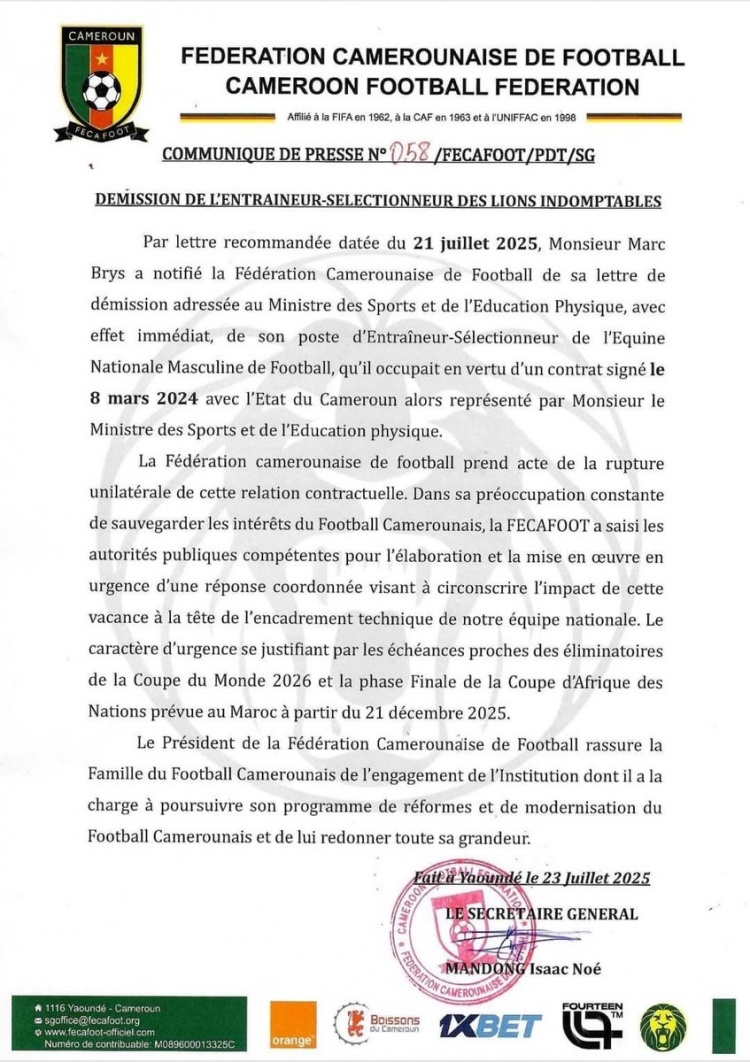 幾個(gè)小時(shí)前,多家媒體流傳了一封據稱(chēng)由布里斯撰寫(xiě)的辭職信,“根據2024年4月8日簽署的合同第七條第四款的規定,我在此通知您,由于超過(guò)60天未支付我和我的團隊的工資,我決定單方面終止該合同?!边@封據稱(chēng)寫(xiě)于2025年7月21日,基于這封信,喀麥隆足協(xié)(FECAFOOT)在7月23日正式宣布比利時(shí)教練離開(kāi)國家隊帥位。