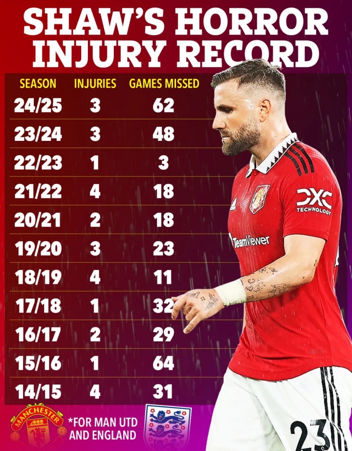 盧克-肖長(cháng)期飽受傷病困擾,《太陽(yáng)報》盤(pán)點(diǎn)了他在曼聯(lián)的傷病史,11個(gè)賽季里,他一共傷缺了339場(chǎng)比賽。上賽季,盧克-肖因小腿受傷,總共只為曼聯(lián)出戰了12場(chǎng)比賽,總計出場(chǎng)時(shí)間不到600分鐘。
