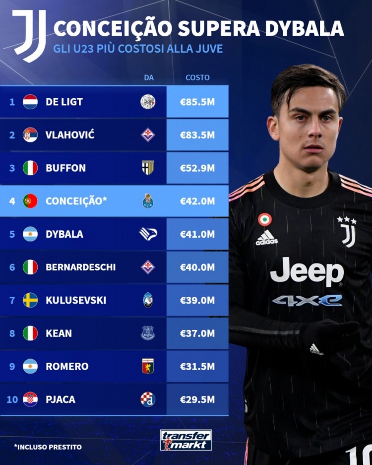 7月26日訊 尤文今夏正式從波爾圖正式簽下小孔塞桑,加上此前的租借費,小孔塞桑的轉會(huì )總價(jià)達4200萬(wàn)歐元。德轉列出尤文圖斯隊史轉會(huì )最貴U23球員榜,其中德里赫特以8550萬(wàn)歐元排名榜首。