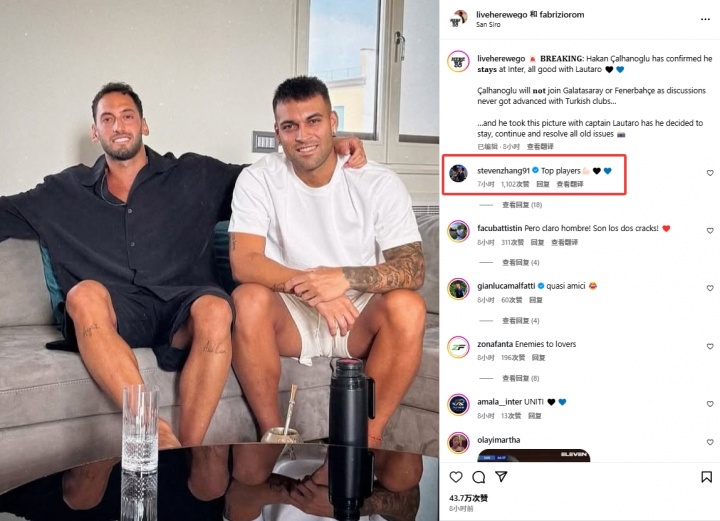 在羅馬諾報道兩人和好的帖子下,前國米主席張康陽(yáng)評論:頂級球員們。