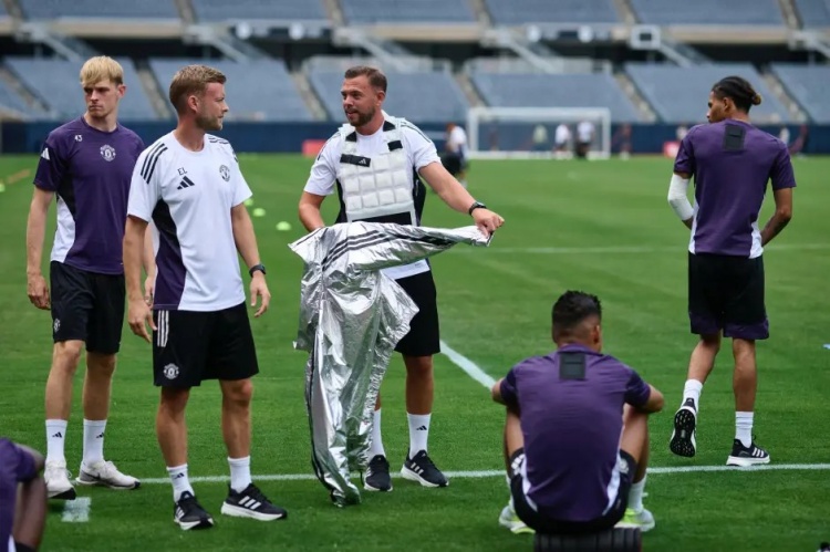 曼聯(lián)體能主管埃德-朗向球員們講解新裝備功效時(shí),一線(xiàn)隊首席體能教練查理-歐文充當了人體模特。主帥阿莫林的弟子們起初面露困惑甚至發(fā)笑,但隨后了解到該裝備能幫助應對酷暑環(huán)境。