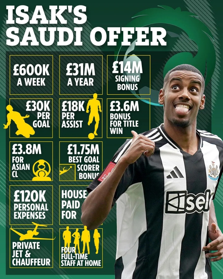 太陽(yáng)報獲悉,在利雅得新月向伊薩克開(kāi)出的合同中,如果贏(yíng)得沙特聯(lián)冠軍,伊薩克將獲得360萬(wàn)英鎊獎金;亞冠冠軍可獲380萬(wàn)英鎊;聯(lián)賽金靴將獲175萬(wàn)英鎊。