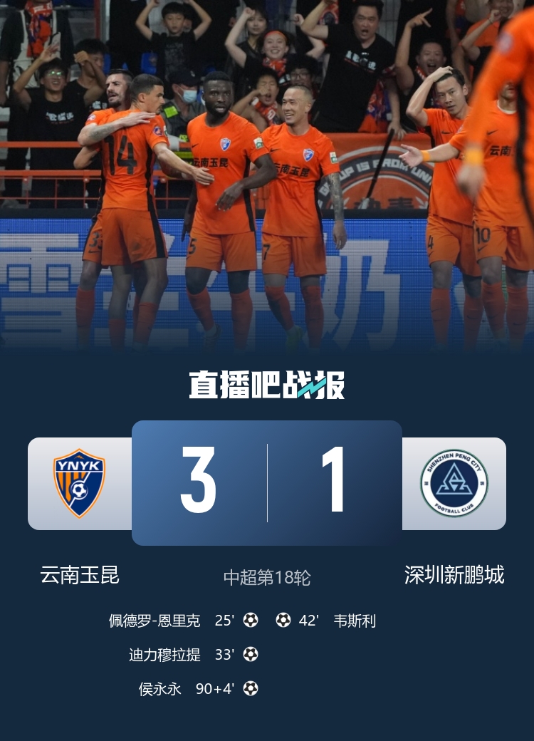 7月26日訊 北京時(shí)間20:00,中超第18輪云南玉昆vs深圳新鵬城。上半場(chǎng),恩里克機敏捅射破門(mén);侯永永中橫梁;隨后約尼查助攻迪力穆拉提再下一城!韋斯利幫助深圳新鵬城扳回一球;奧斯卡包抄破門(mén),但因開(kāi)角球二次觸球被吹。下半場(chǎng),補時(shí)階段侯永永破門(mén)。最終,云南玉昆3-1戰勝深圳新鵬城,各項賽事主場(chǎng)5連勝!先賽升至中超第7;深圳新鵬城仍居第12。