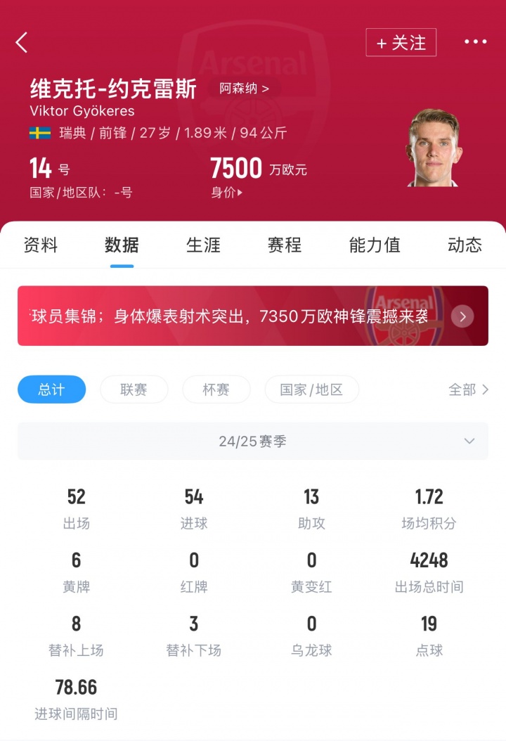 現年27歲的約克雷斯上賽季為葡萄牙體育出戰52場(chǎng)比賽,收獲54球13助。這位瑞典國腳現身價(jià)7500萬(wàn)歐。