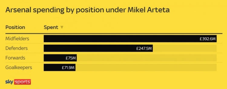 阿爾特塔執教下的阿森納按場(chǎng)上位置區分的轉會(huì )資金投入力度