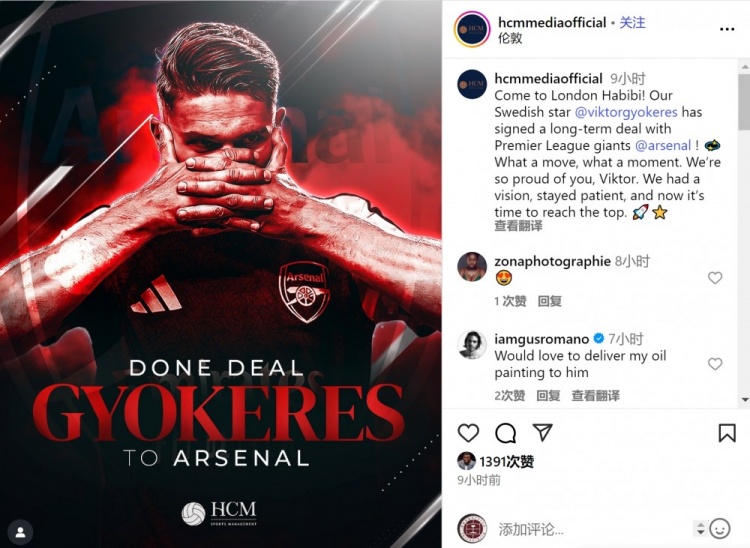 經(jīng)紀公司社媒曬出約克雷斯加盟阿森納的海報,配文:“來(lái)到倫敦!我們的瑞典球星約克雷斯已經(jīng)與英超豪門(mén)阿森納簽下了長(cháng)期合同!”