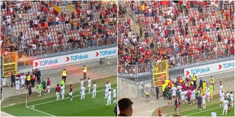 本場(chǎng)比賽在凱澤斯勞滕的主場(chǎng)弗里茨-瓦爾特球場(chǎng)進(jìn)行,但也有不少羅馬球迷隨隊赴客場(chǎng)觀(guān)戰。賽后羅馬全隊來(lái)到客隊看臺區向球迷們致敬,一名羅馬球迷從看臺上跌下來(lái)受傷,當時(shí)他似乎想要爬上球迷隔離欄,卻不慎從大約5米高的地方摔在地上。