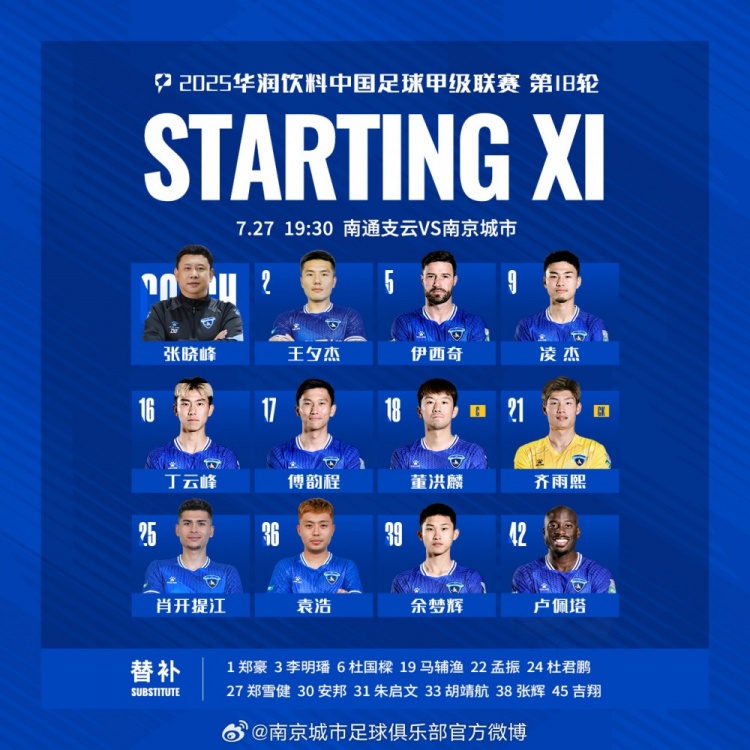 中甲聯(lián)賽第18輪南通支云VS南京城市 首發(fā)名單出爐
