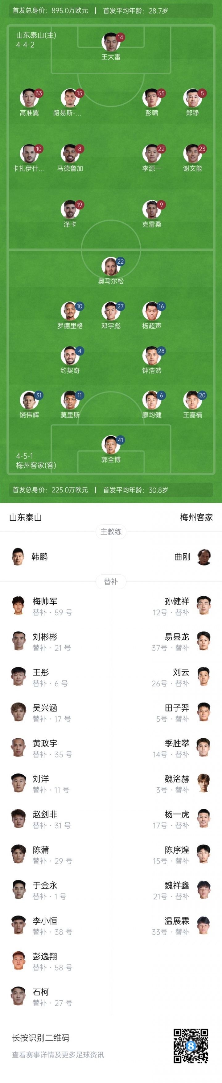 截至賽前,山東泰山7勝4平6負積25分,排名中超積分榜第6;梅州客家3勝4平10負積13分,排名中超積分榜第14。兩隊首回合交鋒,山東泰山客場(chǎng)4-3逆轉戰勝梅州客家。