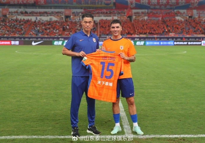比賽賽前,泰山總經(jīng)理宿茂臻為新援路易斯-洛佩斯頒發(fā)15號球衣