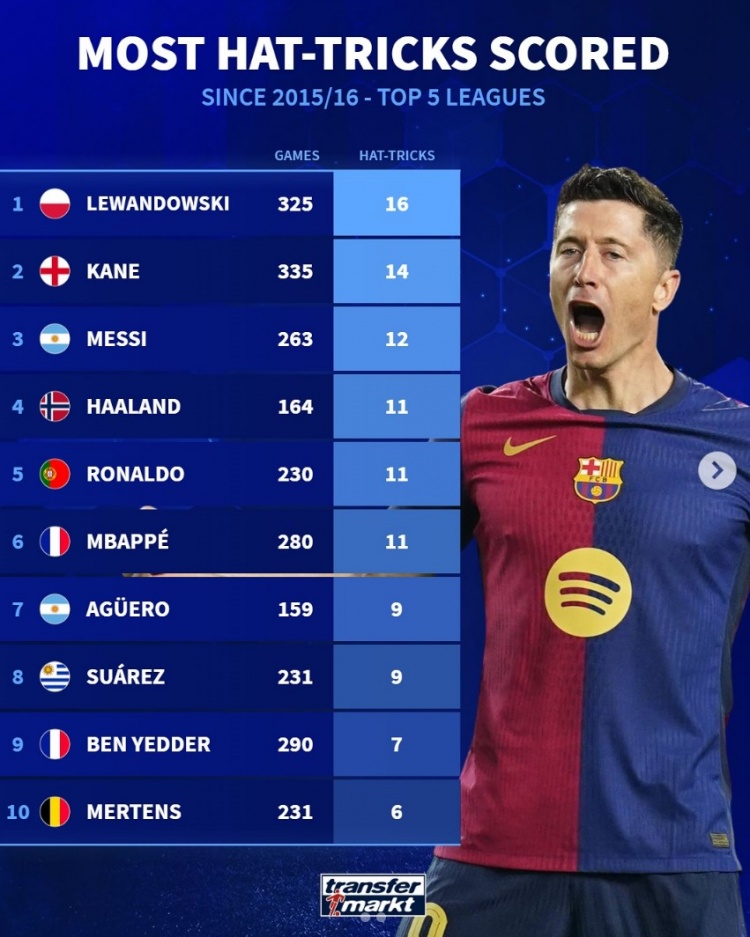 7月27日訊 德轉盤(pán)點(diǎn)了自15/16賽季以來(lái)在五大聯(lián)賽中上演帽子戲法次數榜,其中萊萬(wàn)16次居首,具體如下: