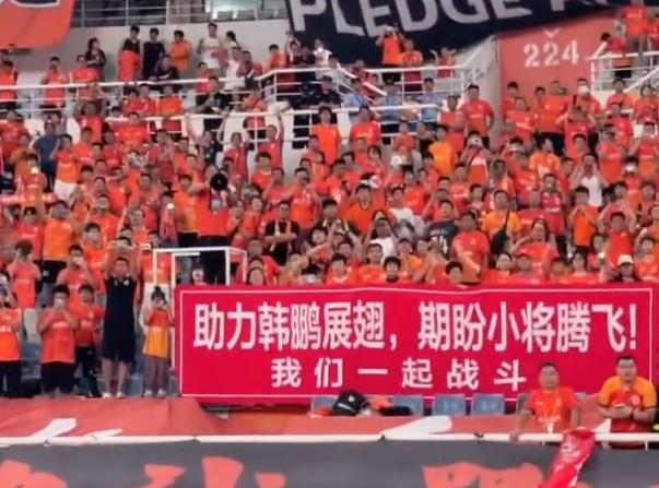 隨著(zhù)九聲汽笛的響起,現場(chǎng)上萬(wàn)名球迷高喊泰山加油助威。泰山隊擊敗梅州,韓鵬取得執教首勝!比賽現場(chǎng),球迷拉出溫暖橫幅:助力韓鵬展翅,期盼小將騰飛!