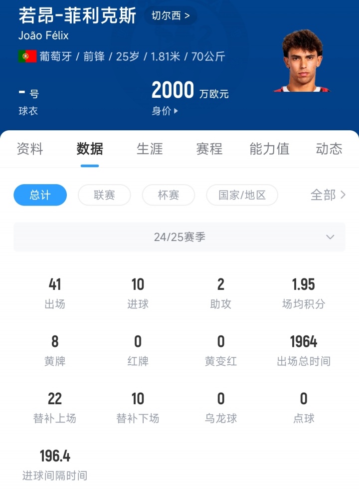 2023年1月,菲利克斯租借加盟切爾西,開(kāi)啟了自己的流浪生涯。兩年間菲利克斯先后輾轉馬競、巴薩、切爾西、AC米蘭4支球隊,但在每支球隊效力都沒(méi)能超過(guò)半年。目前25歲的菲利克斯德轉身價(jià)為2000萬(wàn)歐元,而在19歲時(shí),菲利克斯的最高身價(jià)曾達到1億歐元。