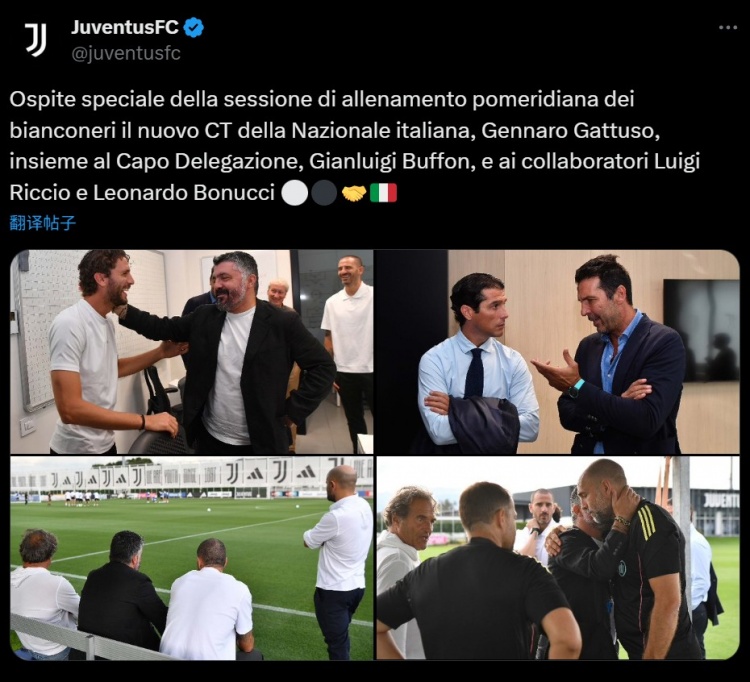 意大利新帥加圖索及領(lǐng)隊布馮、助教博努奇和里奇奧在今日下午造訪(fǎng)了尤文訓練基地,和俱樂(lè )部上下進(jìn)行了友好交流。