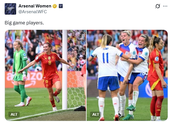 本場(chǎng)決賽雙方在常規時(shí)間戰成1-1。為西班牙進(jìn)球的是效力于阿森納女足的馬里奧娜-卡爾登蒂。英格蘭方面,進(jìn)球的魯索和助攻的凱莉都來(lái)自阿森納。