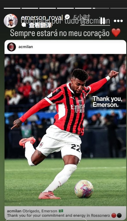 埃默森也在Instagram上回應道:“謝謝米蘭的所有人,你們永遠在我心中?!?/p>