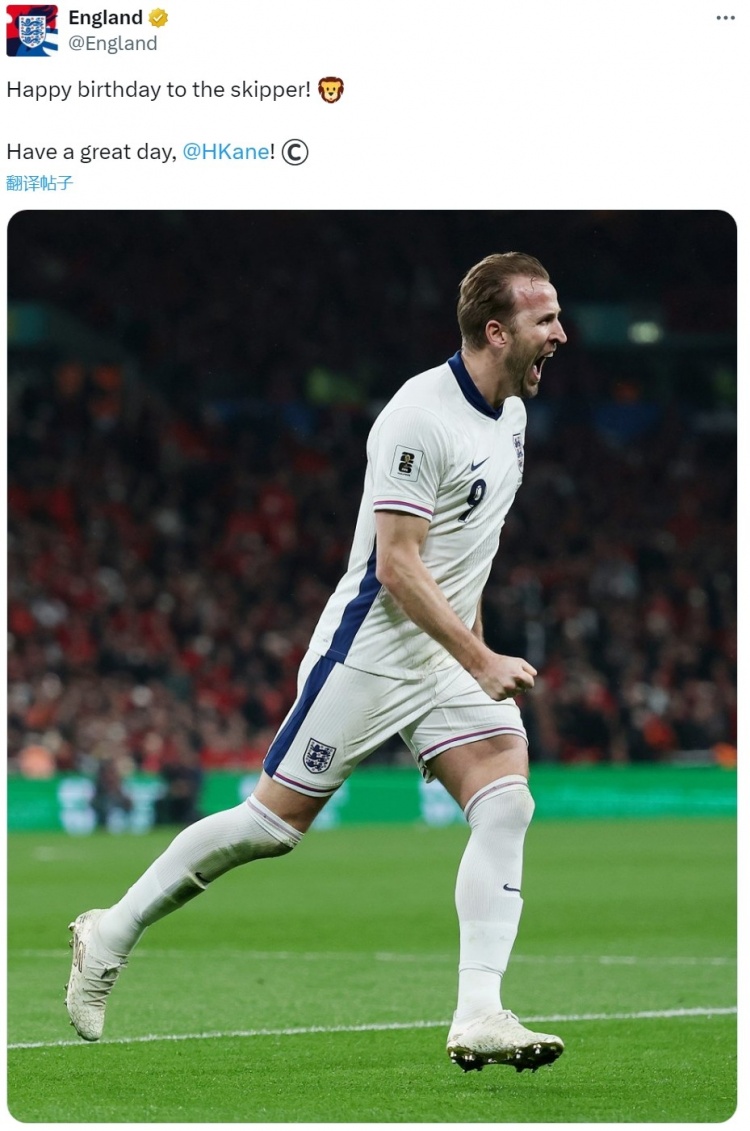 英格蘭隊官方社媒曬出凱恩的照片,配文:“隊長(cháng)生日快樂(lè ),祝你度過(guò)美好的一天!”