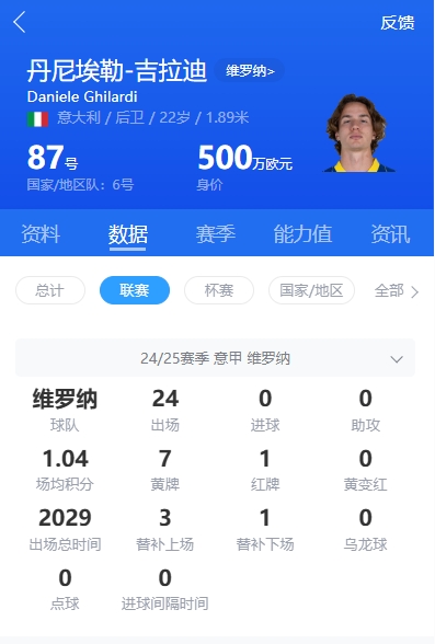 丹尼埃勒-吉拉迪現年22歲,上賽季為維羅納在聯(lián)賽中出場(chǎng)24場(chǎng),現身價(jià)500萬(wàn)歐元。