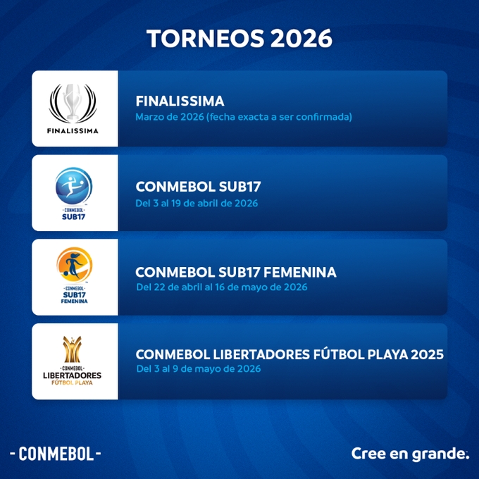 07月29日訊 南美足聯(lián)競賽理事會(huì )公布2026年南美足聯(lián)賽程,歐美杯將于2026年3月進(jìn)行,具體日期待定。