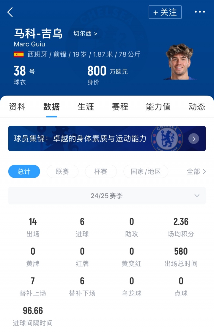 吉烏時(shí)年19歲,上賽季為切爾西出場(chǎng)14場(chǎng),取得了4粒進(jìn)球,目前其德轉身價(jià)為800萬(wàn)歐。