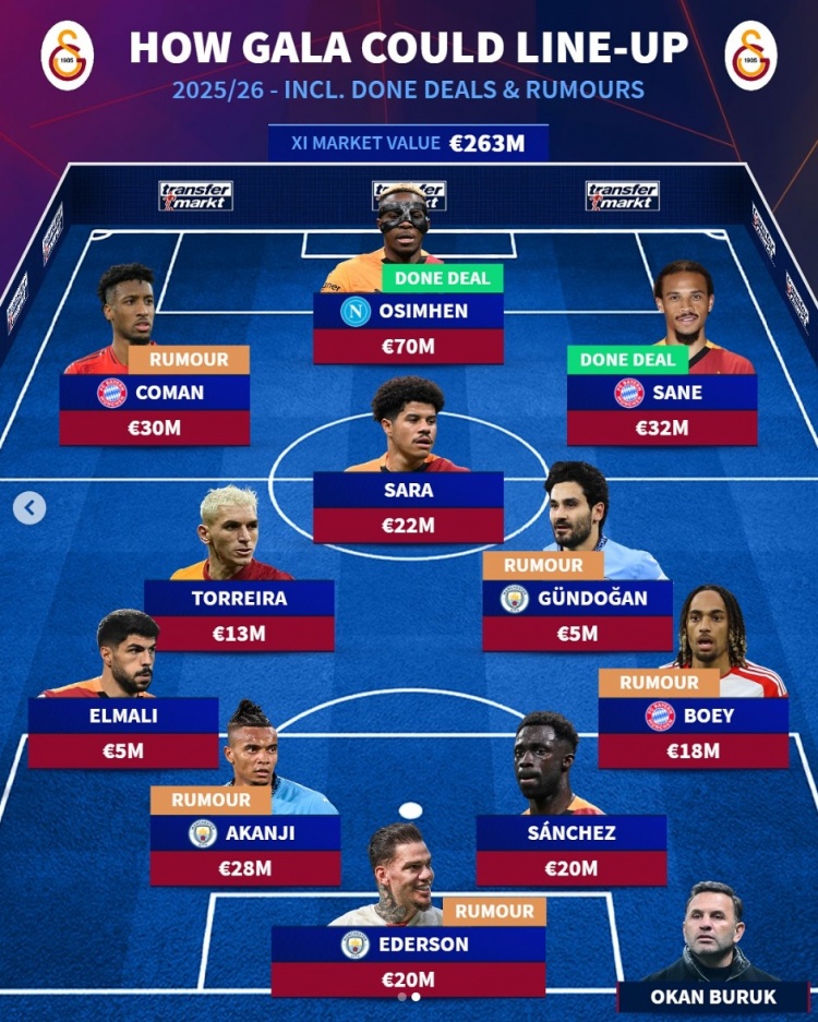 7月31日訊 加拉塔薩雷簽下奧斯梅恩只待正式官宣,《轉會(huì )市場(chǎng)》也根據近期動(dòng)向預測了加拉塔薩雷可能在新賽季排出的主力陣容,拜仁曼城各3將。