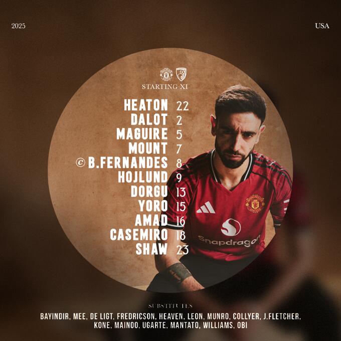 曼聯(lián)首發(fā):22-希頓、2-達洛特、5-馬奎爾、15-約羅、23-盧克-肖、13-多古、18-卡塞米羅、7-芒特、8-B費、9-霍伊倫、16-阿瑪德-迪亞洛