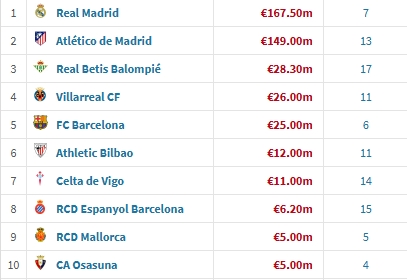 皇馬、馬競之后,排名第三的貝蒂斯目前只花費了2830萬(wàn)歐,第四的比利亞雷亞爾花費2600萬(wàn)歐。巴薩2500萬(wàn)歐暫排第五,引進(jìn)了胡安-加西亞和拉什福德。