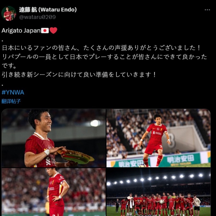 7月31日訊 不久前,隨利物浦結束日本行的遠藤航更新了社交媒體,感謝了日本球迷。