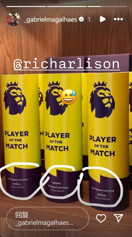 賽后,理查利森在個(gè)人社媒曬了他拿著(zhù)全場(chǎng)最佳球員獎杯的照片,并標記了阿森納后衛加布里埃爾。隨后,加布里埃爾更新社媒,曬出自己3次拿到英超北倫敦德比全場(chǎng)最佳的獎杯予以回擊,他也艾特了理查利森。