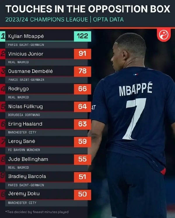 上賽季歐冠賽場(chǎng),姆巴佩是在對方禁區內觸球次數最多的球員。不過(guò)需要注意的是,他在中路的效率并不高,同時(shí)場(chǎng)均跑動(dòng)只有8340米。