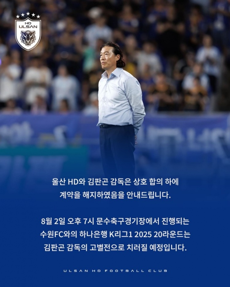 8月1日訊 官方消息,蔚山HD與主帥金判坤協(xié)商一致解除合同。