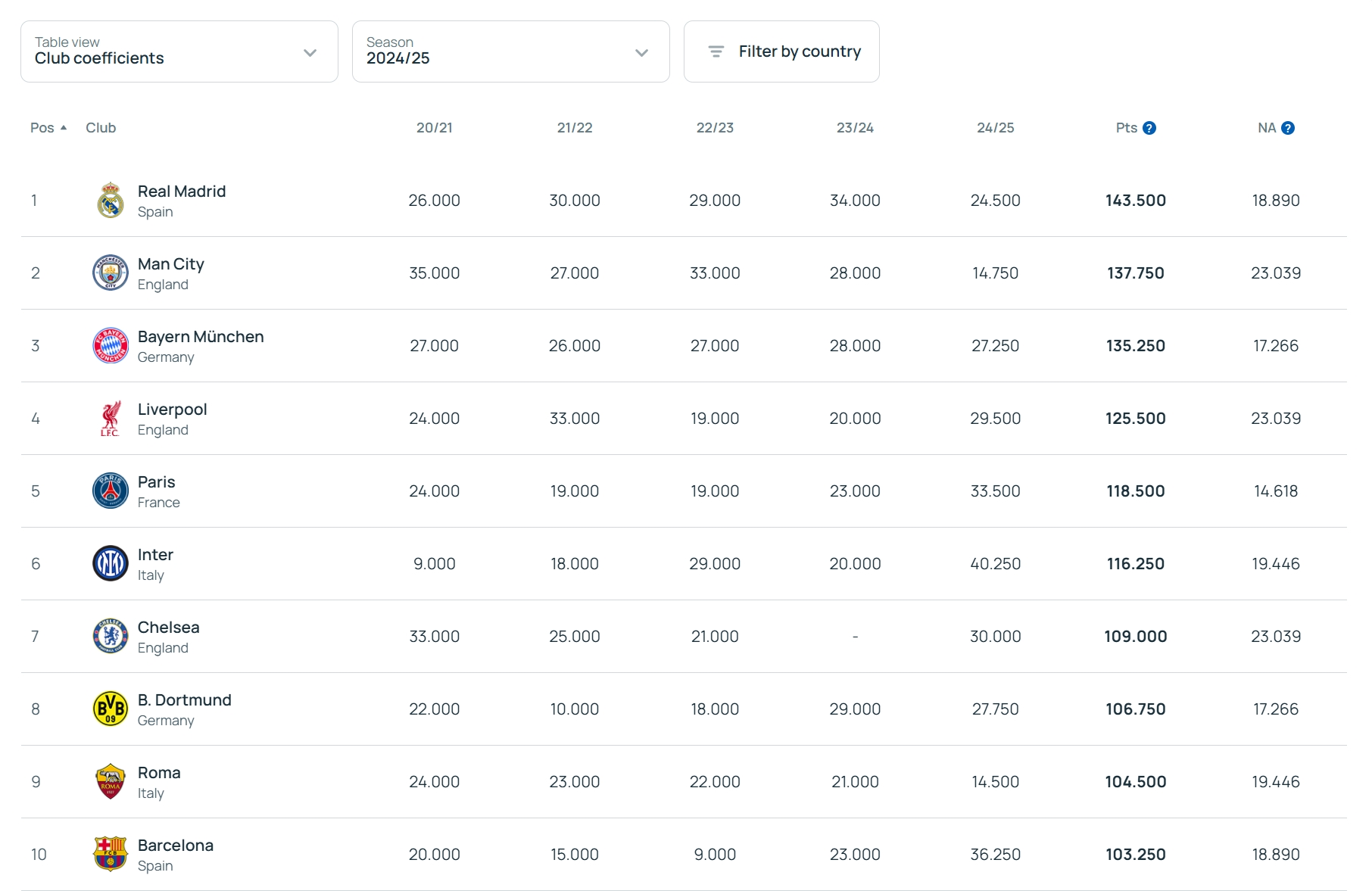 06月02日訊 今日歐足聯(lián)更新了最新一期的俱樂(lè )部系數排名,皇馬、曼城、拜仁排名前三,新科歐冠冠軍巴黎排名第5。