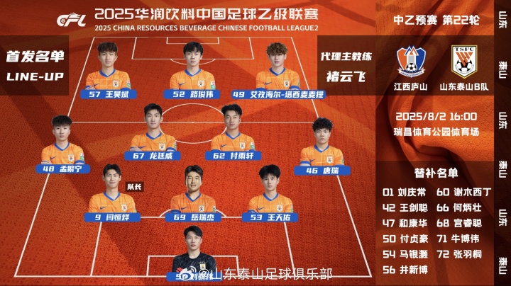 中乙預賽第22輪山東泰山B隊客場(chǎng)與江西廬山隊首發(fā)陣容,加油??