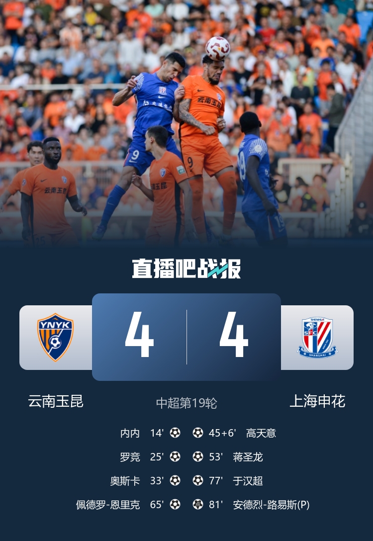 全場(chǎng)比賽結束,上海申花客場(chǎng)4-4戰平云南玉昆。