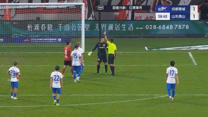 08月02日訊 泰山vs蓉城第58分鐘,王大雷出擊到禁區外放倒費利佩,主裁判一開(kāi)始判罰黃牌,VAR介入后,主裁判親自看回放后改為紅牌,將王大雷罰下!