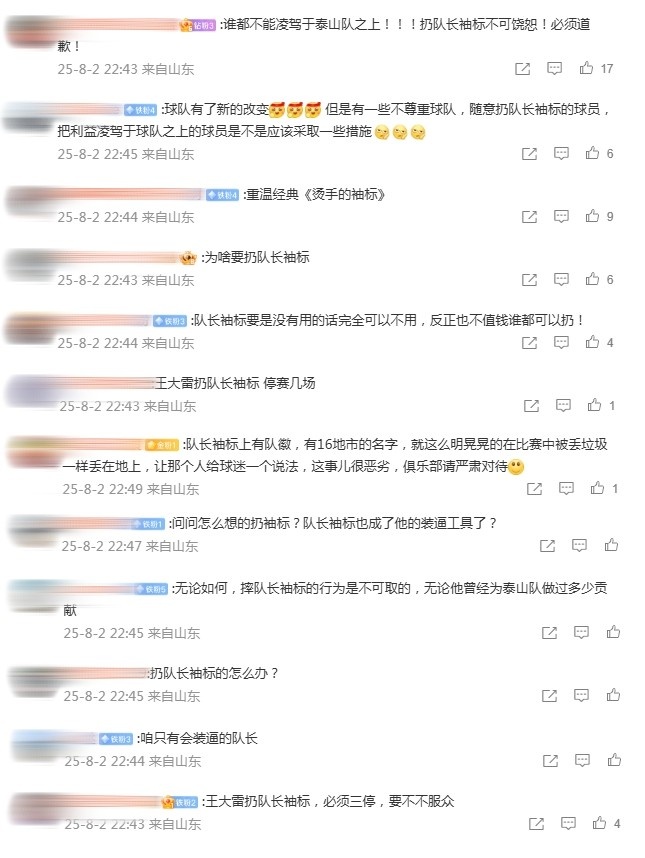 看到王大雷扔袖標的舉動(dòng),山東泰山的球迷感到難以理解。在球隊的官博評論區,球迷留言表達了對王大雷的不滿(mǎn),并希望俱樂(lè )部方面做出處理。