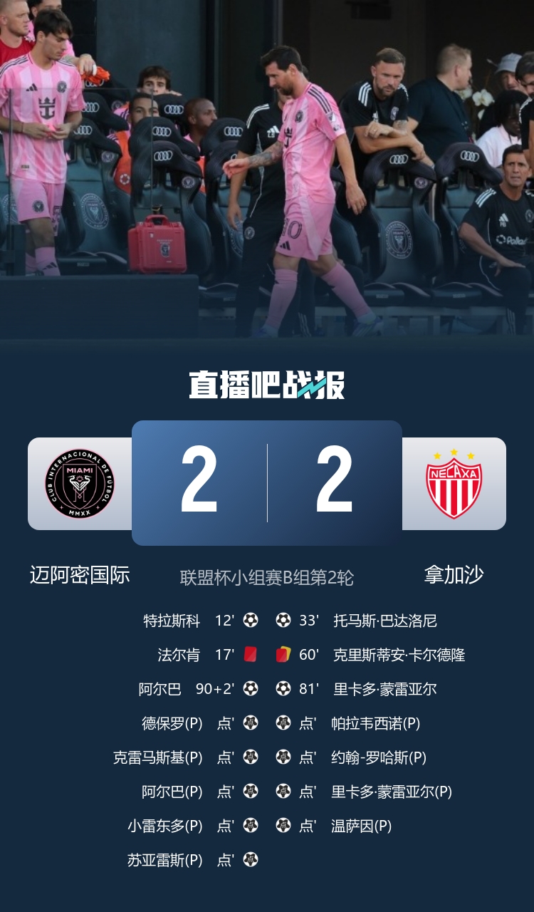 8月3日訊 北京時(shí)間8月3日07:00,聯(lián)盟杯小組賽B組第2輪邁阿密?chē)H迎戰拿加沙的比賽在大通體育場(chǎng)進(jìn)行,上半場(chǎng)梅西第8分鐘傷退,德保羅助攻特拉斯科兜射首開(kāi)記錄,法爾肯直紅被罰下,巴達洛尼抽射扳平比分,半場(chǎng)結束,十人邁阿密?chē)H1-1拿加沙。下半場(chǎng)羅哈斯遠射中楣,卡爾德隆兩黃一紅被罰下,蒙雷亞爾推射反超比分,德保羅助攻阿爾巴頭球絕平,常規時(shí)間結束,十人邁阿密2-2十人拿加沙,點(diǎn)球大戰諾沃撲點(diǎn),最終邁阿密點(diǎn)球戰7比6戰勝拿加沙取得兩連勝。