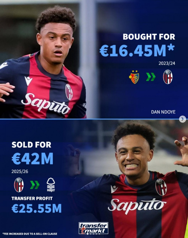 23/24賽季1645萬(wàn)歐買(mǎi)入,今夏4200萬(wàn)歐賣(mài)至諾丁漢森林,凈賺2555萬(wàn)歐